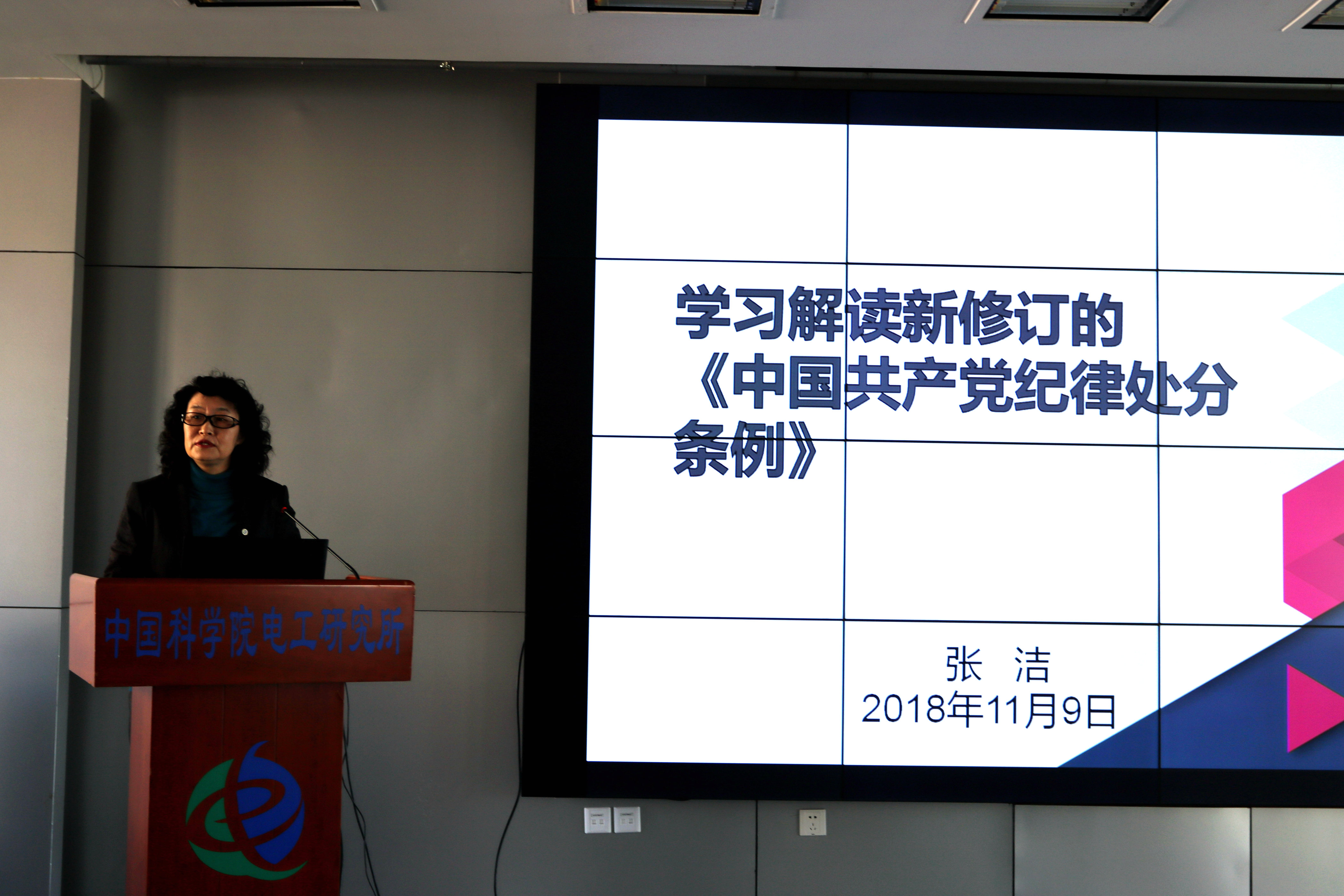 张洁解读新修订的《中国共产党纪律处分条例》,从学习要求、条例要点、修订意义以及贯彻落实4个方面进行了阐述,重点对党的政治纪律、组织纪律、廉政纪律、群众纪律、工作纪律和生活纪律进行了以案说法,进一步强化党纪党规意识。她强调,党中央时隔三年再次对党纪处分条例做出修改,体现了党中央坚持不懈、持之以恒推进从严治党的坚定决心和担当意识,为全面从严治党推向纵深提供了纪律保障。她要求各党支部认真落实教育、管理、监督党员的责任,强化对党员的日常管理和监督,发现问题及时提醒,要利用“三会一课”等形式加强对《条例》的学习,要求各位党员认真研读《条例》,并加强自律意识,不折不扣贯彻落实好党规党纪,为营造、保持研究所风清气正的科研氛围贡献力量。